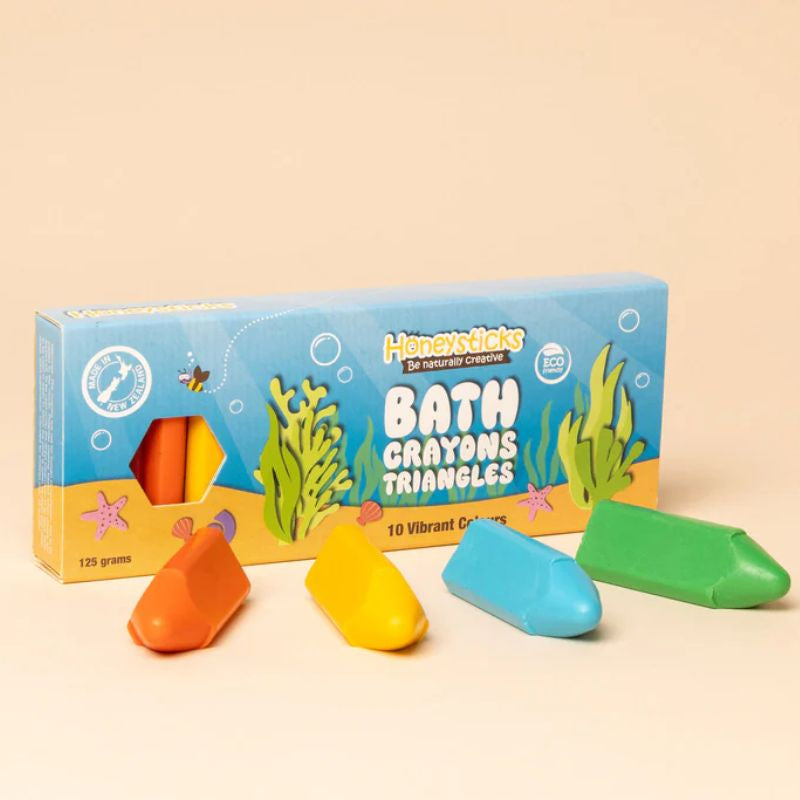 Honeysticks Bath Crayons Triangles are the perfect way to add creativity and fun to bath or shower time. Their unique triangle shape makes them perfect for little hands to hold! Crafted with 100% pure New Zealand Beeswax and Soy Wax.