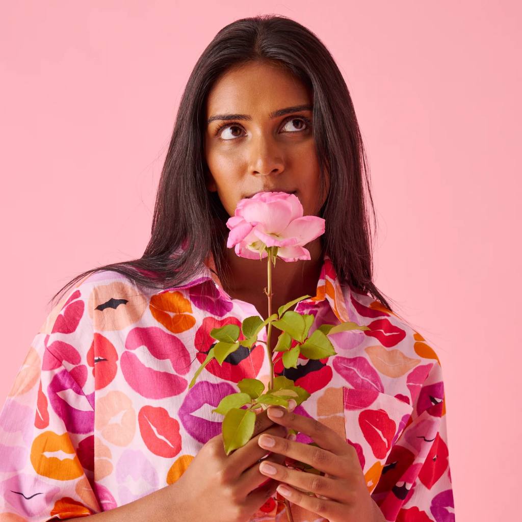 This pyjama set combines comfort with personality. The organic cotton fabric feels luxurious against your skin while the whimsical kiss print adds a touch of fun to bedtime. Perfect for those who appreciate quality sleepwear with a playful edge.