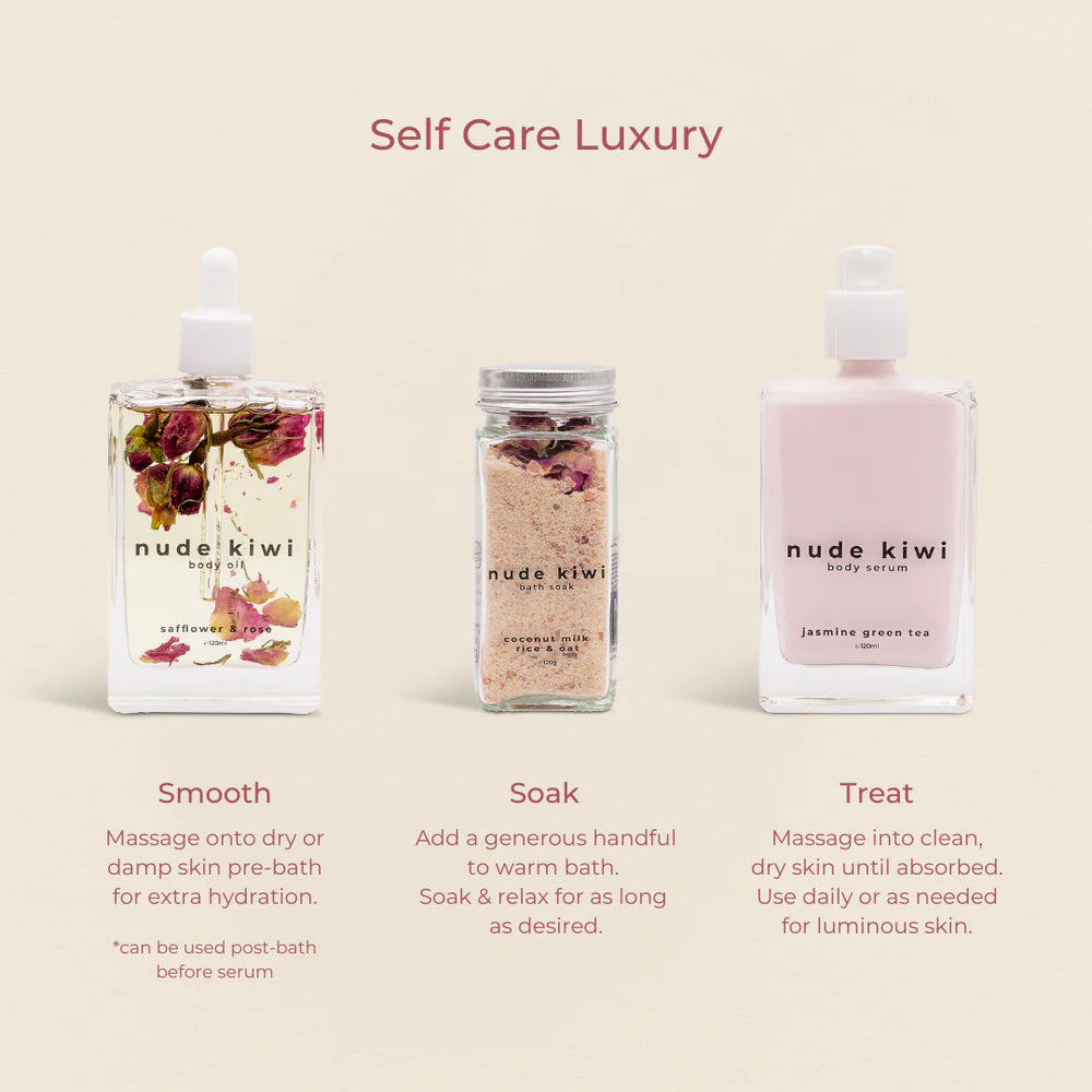 Nude Kiwi | Bath Soak Coconut Milk, Rice & Oat 120g. Cove. Beach Essentials is all about a clean slate after sunscreen, salt and city dust. How it works: Mineral salts ease muscles while coconut milk, oat and rice powders soften and soothe the skin. Ingredients: Full INCI: Himalayan Pink Salt, Epsom Salt, Colloidal Oatmeal, Rose Buds, Lavender Oil, Rose Geranium Oil, Coconut Milk Powder, Rice Powder.