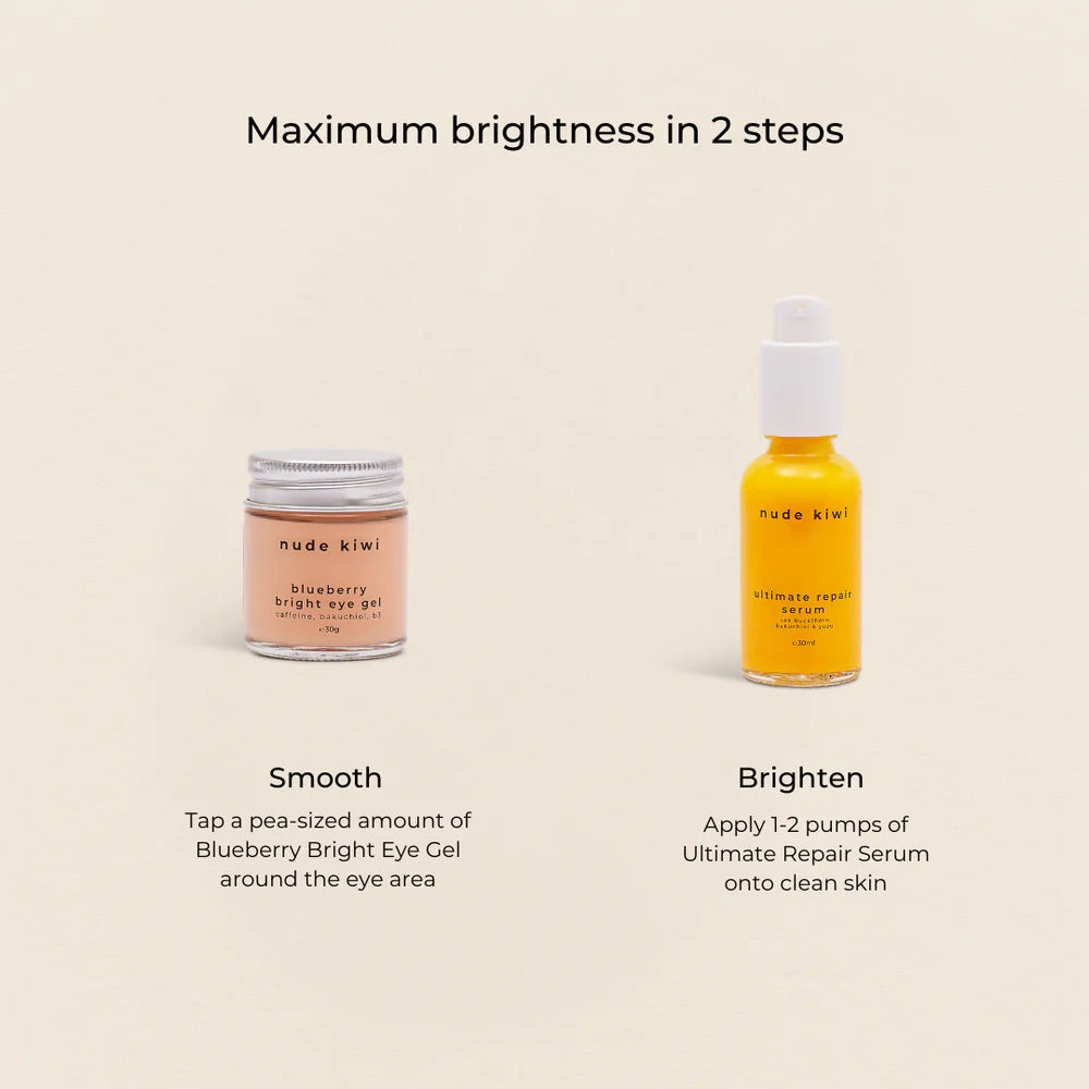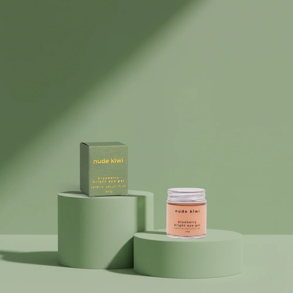 Nude Kiwi | Blueberry Bright Eye Gel 30g. Cove. Beach Essentials is all about wide-awake mornings, cool tides and zero panda eyes. How it works: Caffeine and niacinamide target puffiness and dark circles; blueberry and cornflower soothe while hyaluronic acid hydrates. Expect a light, cooling feel. Ingredients: Aqua, Sodium Acrylates Copolymer, Lecithin, Niacinamide, Hyaluronic Acid, Glycerin, Bakuchiol, Caffeine, Vaccinium Angustifolium (Blueberry) Fruit Extract, Centaurea Cyanus (Cornflower) Flower Extract, Benzyl Alcohol, Dehydroacetic Acid, Lysolecithin, Xanthan Gum, Pullulan, Sodium Phytate, Sclerotium Gum, Aloe Barbadensis Leaf Juice.