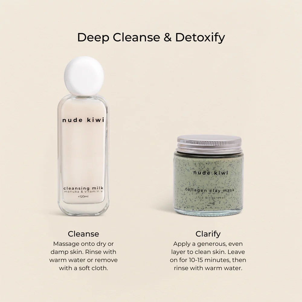 Nude Kiwi | Collagen Clay Mask NZ 100g. Cove. Beach Essentials is all about timeout, tunes on and pores behaving themselves. How it works: Green clay and charcoal draw out impurities, while marine collagen and chia help the skin feel firm and balanced. Ingredients: Key: French Green Clay, Activated Charcoal, Chia Seed Oil, Marine Collagen, Cupuacu Butter.